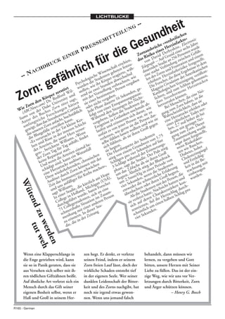 Das Dokument behandelt die Auswirkungen von Zorn und Stress auf die Gesundheit, insbesondere im Zusammenhang mit Herz-Kreislauf-Erkrankungen. Es wird erläutert, wie emotionale Zustände das Risiko von Herzinfarkten und anderen kardiovaskulären Problemen beeinflussen können. Zudem wird betont, dass das Vergeben und die innere Ruhe Schutz bieten können, um den negativen Folgen von Zorn und Bitterkeit entgegenzuwirken.