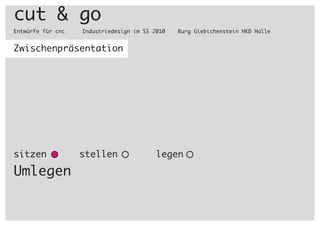 Das Dokument beschreibt die Zwischenpräsentation der Entwürfe für CNC-Industriedesign im Sommersemester 2010 an der Hochschule Burg Giebichenstein in Halle. Es enthält verschiedene Ideen und Konzepte, wie Sitzgelegenheiten und Möbel unter dem Titel 'cut & go' gestaltet werden können. Wiederholte Begriffe wie 'sitzen', 'legen' und 'huckepack' verdeutlichen die Kernnutzung und Flexibilität der Entwürfe.