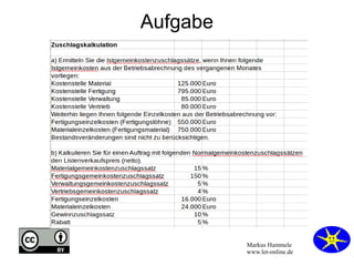 Das Dokument behandelt eine Aufgabe zur Zuschlagskalkulation, die von Markus Hammel erstellt wurde. Es enthält sowohl die Aufgabenbeschreibung als auch die Lösung zu dieser Aufgabe. Die Website www.let-online.de wird als Quelle genannt.