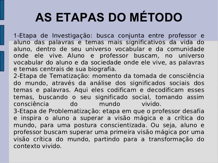 AS ETAPAS DO MÉTODO 1 -Etapa de Investigação: busca conjunta entre professor e aluno das palavras e temas mais significati...