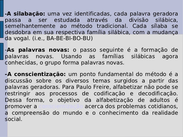 5. 5. - A silabação: uma vez identificadas, cada palavra geradora passa a ser estudada através da divisão silábica, semelhantemente ao método tradicional. Cada sílaba se desdobra em sua respectiva família silábica, com a mudança da vogal. (i.e., BA-BE-BI-BO-BU)‏ - As palavras novas: o passo seguinte é a formação de palavras novas. Usando as famílias silábicas agora conhecidas, o grupo forma palavras novas. -A conscientização: um ponto fundamental do método é a discussão sobre os diversos temas surgidos a partir das palavras geradoras. Para Paulo Freire, alfabetizar não pode se restringir aos processos de codificação e decodificação. Dessa forma, o objetivo da alfabetização de adultos é promover a conscientização acerca dos problemas cotidianos, a compreensão do mundo e o conhecimento da realidade social.