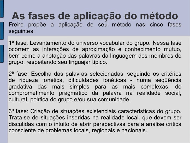 6. 6. As fases de aplicação do método Freire propõe a aplicação de seu método nas cinco fases seguintes: 1ª fase: Levantamento do universo vocabular do grupo. Nessa fase ocorrem as interações de aproximação e conhecimento mútuo, bem como a anotação das palavras da linguagem dos membros do grupo, respeitando seu linguajar típico. 2ª fase: Escolha das palavras selecionadas, seguindo os critérios de riqueza fonética, dificuldades fonéticas - numa seqüência gradativa das mais simples para as mais complexas, do comprometimento pragmático da palavra na realidade social, cultural, política do grupo e/ou sua comunidade. 3ª fase: Criação de situações existenciais características do grupo. Trata-se de situações inseridas na realidade local, que devem ser discutidas com o intuito de abrir perspectivas para a análise crítica consciente de problemas locais, regionais e nacionais.