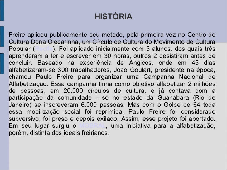 8. 8. HISTÓRIA Freire aplicou publicamente seu método, pela primeira vez no Centro de Cultura Dona Olegarinha, um Círculo de Cultura do Movimento de Cultura Popular ( Recife ). Foi aplicado inicialmente com 5 alunos, dos quais três aprenderam a ler e escrever em 30 horas, outros 2 desistiram antes de concluir. Baseado na experiência de Angicos, onde em 45 dias alfabetizaram-se 300 trabalhadores, João Goulart, presidente na época, chamou Paulo Freire para organizar uma Campanha Nacional de Alfabetização. Essa campanha tinha como objetivo alfabetizar 2 milhões de pessoas, em 20.000 círculos de cultura, e já contava com a participação da comunidade - só no estado da Guanabara (Rio de Janeiro) se inscreveram 6.000 pessoas. Mas com o Golpe de 64 toda essa mobilização social foi reprimida, Paulo Freire foi considerado subversivo, foi preso e depois exilado. Assim, esse projeto foi abortado. Em seu lugar surgiu o MOBRAL , uma iniciativa para a alfabetização, porém, distinta dos ideais freirianos.
