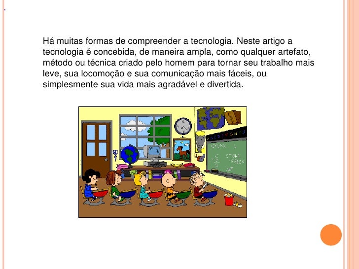 2. 2. . Há muitas formas de compreender a tecnologia. Neste artigo a tecnologia é concebida, de maneira ampla, como qualquer artefato, método ou técnica criado pelo homem para tornar seu trabalho mais leve, sua locomoção e sua comunicação mais fáceis, ou simplesmente sua vida mais agradável e divertida.