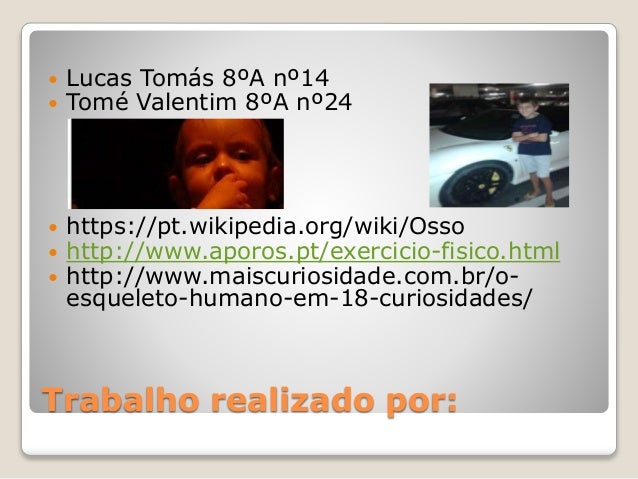 10. 10. Trabalho realizado por:  Lucas Tomás 8ºA nº14  Tomé Valentim 8ºA nº24  https://pt.wikipedia.org/wiki/Osso  http://www.aporos.pt/exercicio-fisico.html  http://www.maiscuriosidade.com.br/o- esqueleto-humano-em-18-curiosidades/