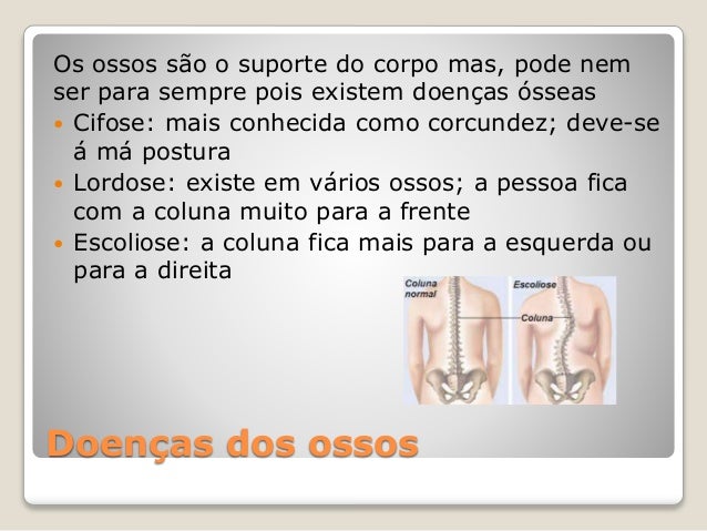 5. 5. Doenças dos ossos Os ossos são o suporte do corpo mas, pode nem ser para sempre pois existem doenças ósseas  Cifose: mais conhecida como corcundez; deve-se á má postura  Lordose: existe em vários ossos; a pessoa fica com a coluna muito para a frente  Escoliose: a coluna fica mais para a esquerda ou para a direita