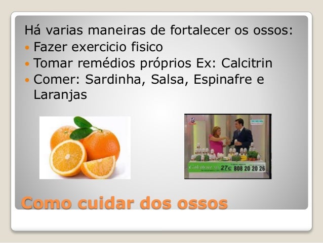 7. 7. Como cuidar dos ossos Há varias maneiras de fortalecer os ossos:  Fazer exercicio fisico  Tomar remédios próprios Ex: Calcitrin  Comer: Sardinha, Salsa, Espinafre e Laranjas