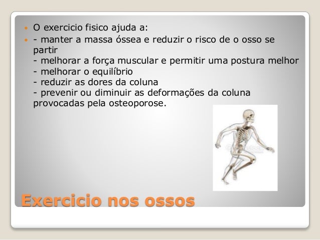 8. 8. Exercicio nos ossos  O exercicio fisico ajuda a:  - manter a massa óssea e reduzir o risco de o osso se partir - melhorar a força muscular e permitir uma postura melhor - melhorar o equilíbrio - reduzir as dores da coluna - prevenir ou diminuir as deformações da coluna provocadas pela osteoporose.
