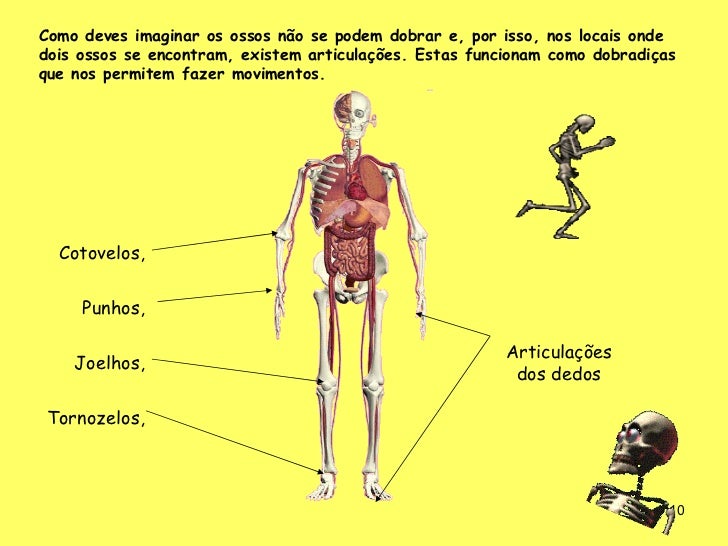 10. 10. Cotovelos, Punhos, Joelhos, Tornozelos, Como deves imaginar os ossos não se podem dobrar e, por isso, nos locais onde dois ossos se encontram, existem articulações. Estas funcionam como dobradiças que nos permitem fazer movimentos. Articulações dos dedos