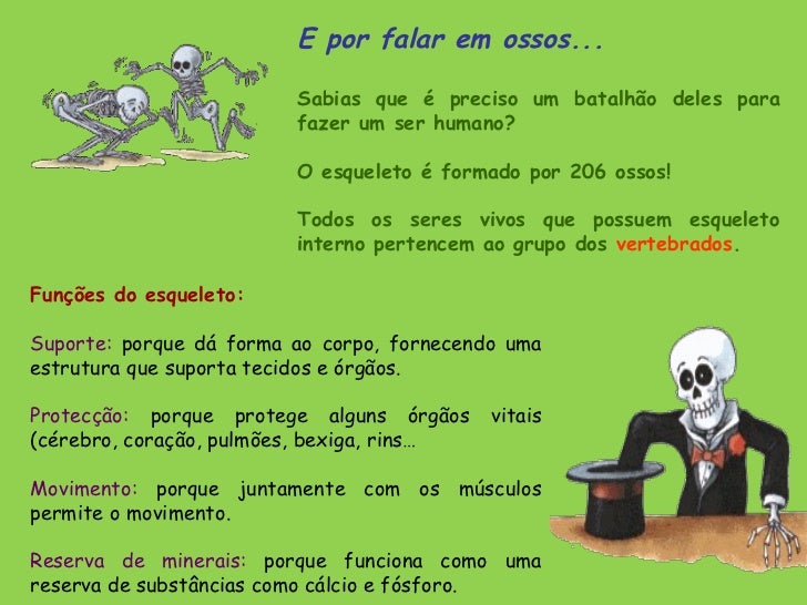 2. 2. E por falar em ossos... Sabias que é preciso um batalhão deles para fazer um ser humano? O esqueleto é formado por 206 ossos! Todos os seres vivos que possuem esqueleto interno pertencem ao grupo dos vertebrados . Funções do esqueleto: Suporte: porque dá forma ao corpo, fornecendo uma estrutura que suporta tecidos e órgãos. Protecção: porque protege alguns órgãos vitais (cérebro, coração, pulmões, bexiga, rins… Movimento: porque juntamente com os músculos permite o movimento. Reserva de minerais: porque funciona como uma reserva de substâncias como cálcio e fósforo.