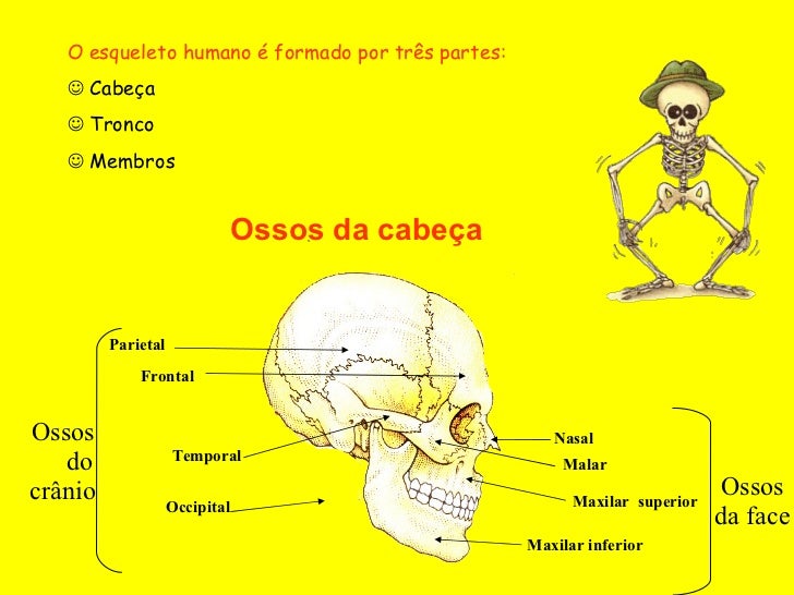 Ossos da cabeça O esqueleto humano é formado por três partes:    Cabeça    Tronco    Membros Parietal Frontal Occipital...
