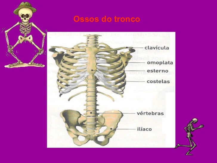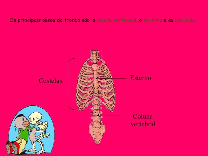4. 4. Os principais ossos do tronco são: a coluna vertebral , o esterno e as costelas . Esterno Coluna vertebral Costelas
