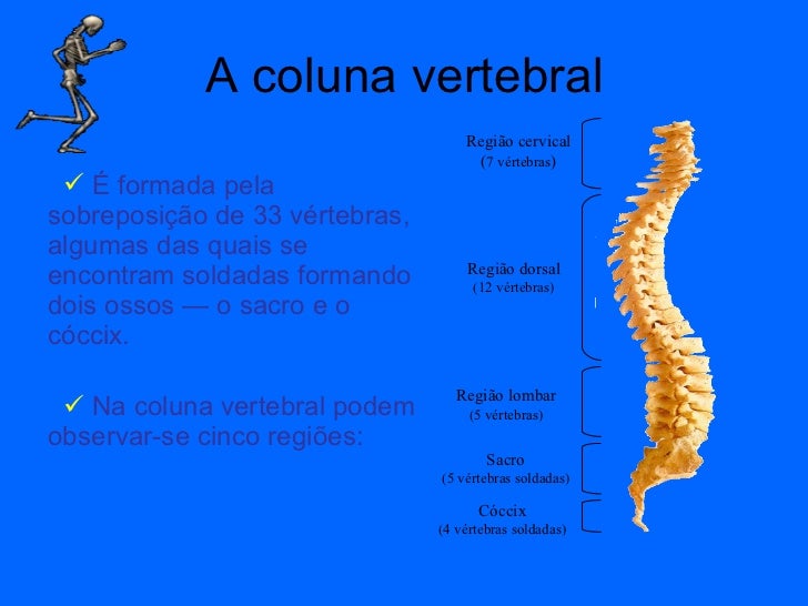 5. 5. A coluna vertebral <ul><li>É formada pela sobreposição de 33 vértebras, algumas das quais se encontram soldadas formando dois ossos — o sacro e o cóccix. </li></ul><ul><li>Na coluna vertebral podem observar-se cinco regiões: </li></ul>Região cervical ( 7 vértebras ) Região dorsal (12 vértebras) Região lombar (5 vértebras) Sacro (5 vértebras soldadas) Cóccix (4 vértebras soldadas)