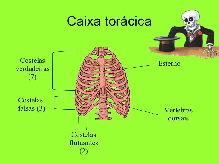 6. 6. Caixa torácica Esterno Vértebras dorsais Costelas verdadeiras (7) Costelas falsas (3) Costelas flutuantes (2)