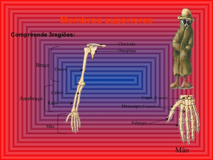 Membros superiores <ul><li>Compreende 3regiões:  </li></ul>Mão Clavícula Omoplata Úmero Braço Antebraço Rádio Cúbito Mão C...