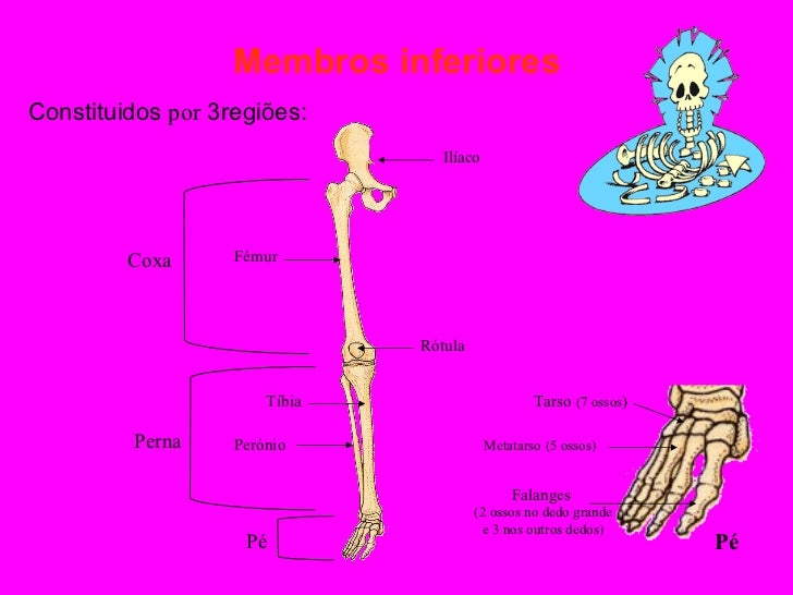 Membros inferiores <ul><li>Constituidos  por  3regiões: </li></ul>Pé Ilíaco Fémur Coxa Tíbia Perónio Perna Pé Rótula Metat...