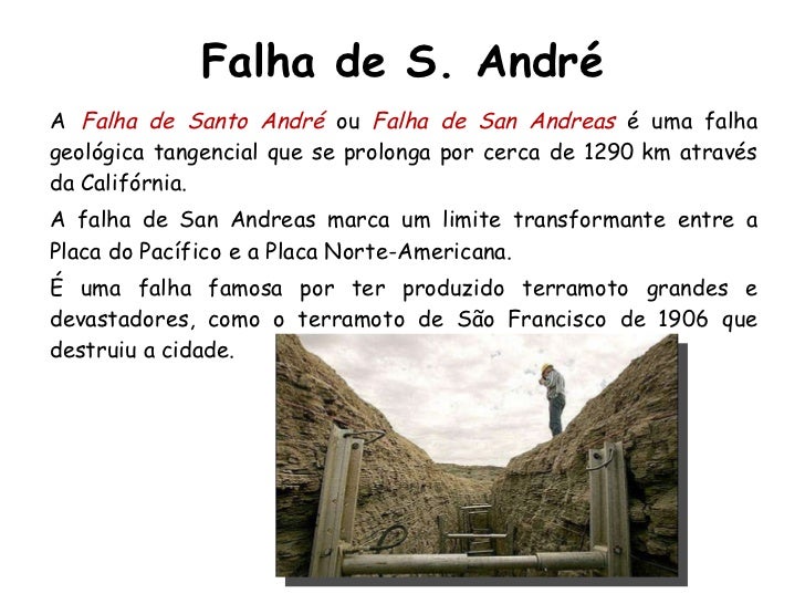 10. 10. Falha de S. André <ul><li>A Falha de Santo André ou Falha de San Andreas é uma falha geológica tangencial que se prolonga por cerca de 1290 km através da Califórnia. </li></ul><ul><li>A falha de San Andreas marca um limite transformante entre a Placa do Pacífico e a Placa Norte-Americana. </li></ul><ul><li>É uma falha famosa por ter produzido terramoto grandes e devastadores, como o terramoto de São Francisco de 1906 que destruiu a cidade. </li></ul>