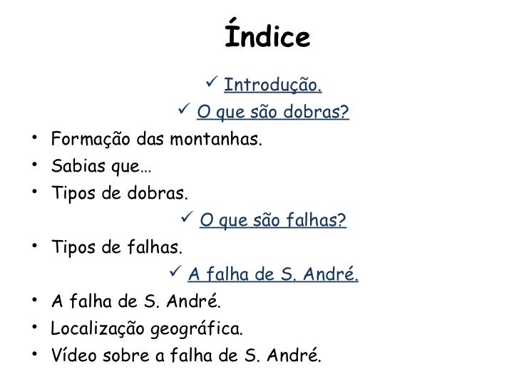 2. 2. <ul><li>Introdução. </li></ul><ul><li>O que são dobras? </li></ul><ul><li>Formação das montanhas. </li></ul><ul><li>Sabias que… </li></ul><ul><li>Tipos de dobras. </li></ul><ul><li>O que são falhas? </li></ul><ul><li>Tipos de falhas. </li></ul><ul><li>A falha de S. André. </li></ul><ul><li>A falha de S. André. </li></ul><ul><li>Localização geográfica. </li></ul><ul><li>Vídeo sobre a falha de S. André. </li></ul>Índice