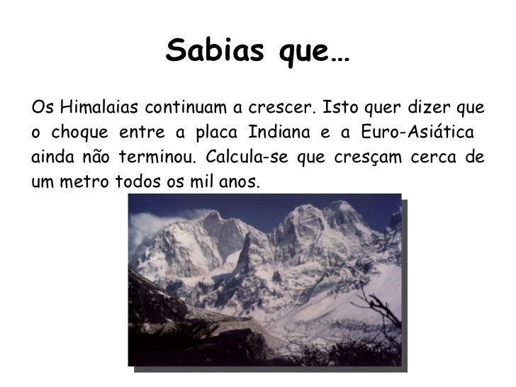 5. 5. Sabias que… <ul><li>Os Himalaias continuam a crescer. Isto quer dizer que o choque entre a placa Indiana e a Euro-Asiática ainda não terminou. Calcula-se que cresçam cerca de um metro todos os mil anos. </li></ul>
