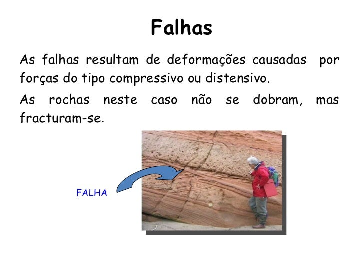 8. 8. Falhas <ul><li>As falhas resultam de deformações causadas por forças do tipo compressivo ou distensivo. </li></ul><ul><li>As rochas neste caso não se dobram, mas fracturam-se . </li></ul>FALHA