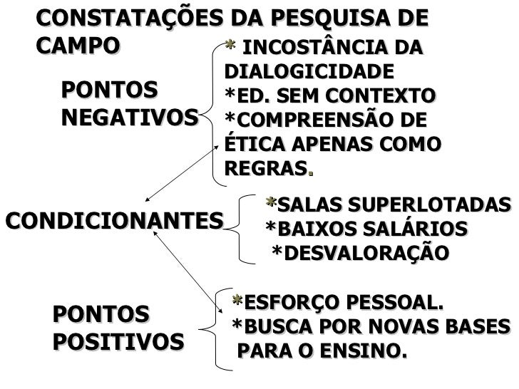 CONSTATAÇÕES DA PESQUISA DE CAMPO PONTOS NEGATIVOS *  INCOSTÂNCIA DA DIALOGICIDADE *ED. SEM CONTEXTO *COMPREENSÃO DE ÉTICA...