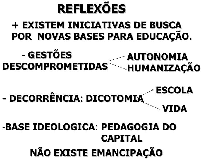 11. 11. REFLEXÕES - GESTÕES DESCOMPROMETIDAS - DECORRÊNCIA : DICOTOMIA ESCOLA VIDA PEDAGOGIA DO CAPITAL + EXISTEM INICIATIVAS DE BUSCA POR NOVAS BASES PARA EDUCAÇÃO. AUTONOMIA HUMANIZAÇÃO - BASE IDEOLOGICA : NÃO EXISTE EMANCIPAÇÃO