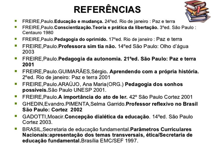 REFERÊNCIAS <ul><li>FREIRE,Paulo. Educação e mudança.  24ºed. Rio de janeiro : Paz e terra </li></ul><ul><li>FREIRE,Paulo....