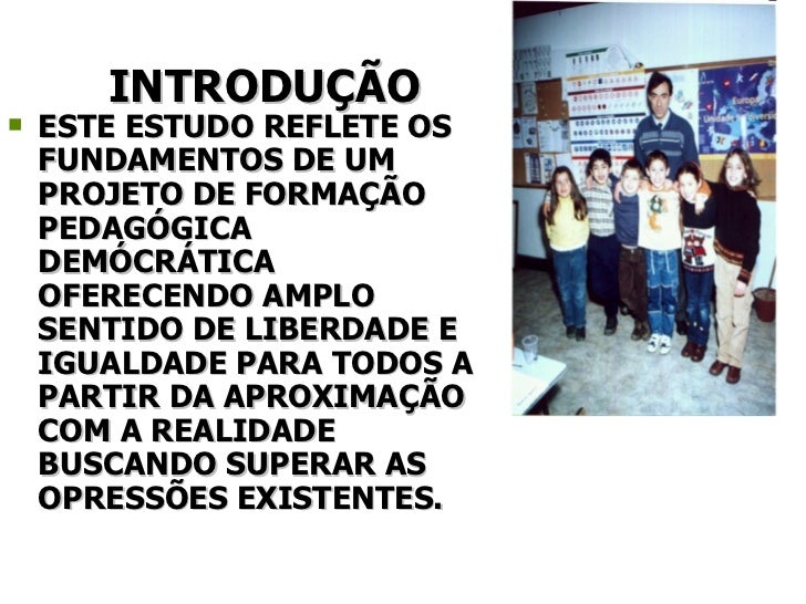 2. 2. INTRODUÇÃO <ul><li>ESTE ESTUDO REFLETE OS FUNDAMENTOS DE UM PROJETO DE FORMAÇÃO PEDAGÓGICA DEMÓCRÁTICA OFERECENDO AMPLO SENTIDO DE LIBERDADE E IGUALDADE PARA TODOS A PARTIR DA APROXIMAÇÃO COM A REALIDADE BUSCANDO SUPERAR AS OPRESSÕES EXISTENTES. </li></ul>