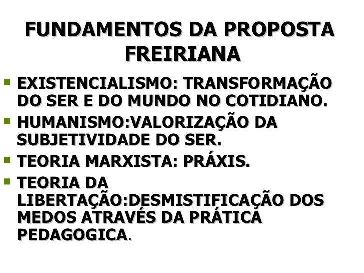 3. 3. FUNDAMENTOS DA PROPOSTA FREIRIANA <ul><li>EXISTENCIALISMO: TRANSFORMAÇÃO DO SER E DO MUNDO NO COTIDIANO. </li></ul><ul><li>HUMANISMO:VALORIZAÇÃO DA SUBJETIVIDADE DO SER. </li></ul><ul><li>TEORIA MARXISTA: PRÁXIS. </li></ul><ul><li>TEORIA DA LIBERTAÇÃO:DESMISTIFICAÇÃO DOS MEDOS ATRAVÉS DA PRÁTICA PEDAGOGICA . </li></ul>