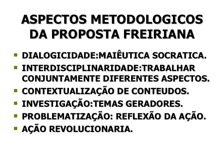 4. 4. ASPECTOS METODOLOGICOS DA PROPOSTA FREIRIANA <ul><li>DIALOGICIDADE:MAIÊUTICA SOCRATICA. </li></ul><ul><li>INTERDISCIPLINARIDADE:TRABALHAR CONJUNTAMENTE DIFERENTES ASPECTOS. </li></ul><ul><li>CONTEXTUALIZAÇÃO DE CONTEUDOS. </li></ul><ul><li>INVESTIGAÇÃO:TEMAS GERADORES. </li></ul><ul><li>PROBLEMATIZAÇÃO: REFLEXÃO DA AÇÃO. </li></ul><ul><li>AÇÃO REVOLUCIONARIA. </li></ul>