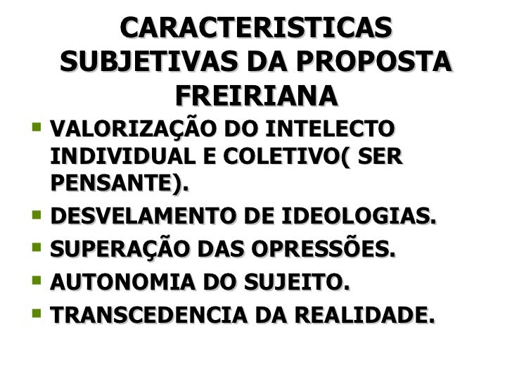 CARACTERISTICAS SUBJETIVAS DA PROPOSTA FREIRIANA <ul><li>VALORIZAÇÃO DO INTELECTO INDIVIDUAL E COLETIVO( SER PENSANTE). </...