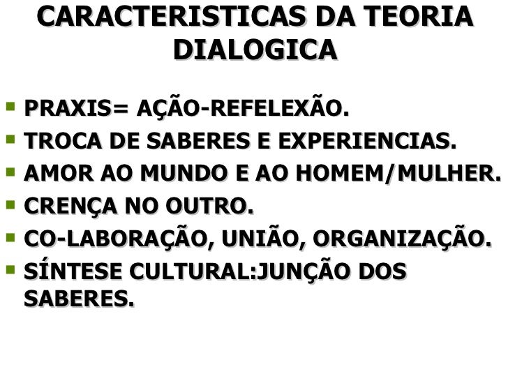 CARACTERISTICAS DA TEORIA DIALOGICA <ul><li>PRAXIS= AÇÃO-REFELEXÃO. </li></ul><ul><li>TROCA DE SABERES E EXPERIENCIAS. </l...