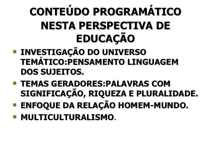 7. 7. CONTEÚDO PROGRAMÁTICO NESTA PERSPECTIVA DE EDUCAÇÃO <ul><li>INVESTIGAÇÃO DO UNIVERSO TEMÁTICO:PENSAMENTO LINGUAGEM DOS SUJEITOS. </li></ul><ul><li>TEMAS GERADORES:PALAVRAS COM SIGNIFICAÇÃO, RIQUEZA E PLURALIDADE. </li></ul><ul><li>ENFOQUE DA RELAÇÃO HOMEM-MUNDO. </li></ul><ul><li>MULTICULTURALISMO . </li></ul>