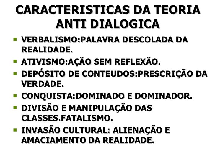 8. 8. CARACTERISTICAS DA TEORIA ANTI DIALOGICA <ul><li>VERBALISMO:PALAVRA DESCOLADA DA REALIDADE. </li></ul><ul><li>ATIVISMO:AÇÃO SEM REFLEXÃO. </li></ul><ul><li>DEPÓSITO DE CONTEUDOS:PRESCRIÇÃO DA VERDADE. </li></ul><ul><li>CONQUISTA:DOMINADO E DOMINADOR. </li></ul><ul><li>DIVISÃO E MANIPULAÇÃO DAS CLASSES.FATALISMO. </li></ul><ul><li>INVASÃO CULTURAL: ALIENAÇÃO E AMACIAMENTO DA REALIDADE. </li></ul>